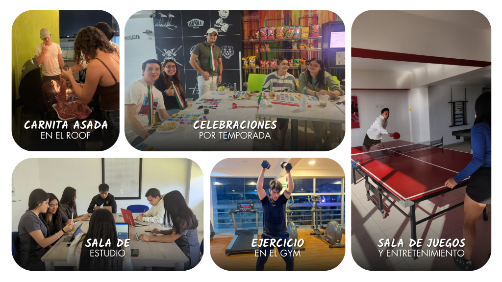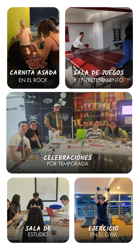 Convive con estudiantes de diferentes universidades en un ambiente con buena vibra, áreas comunes que inspiran convivencia y todo lo necesario para concentrarte en lo que importa: estudiar, descansar y disfrutar tu etapa universitaria.